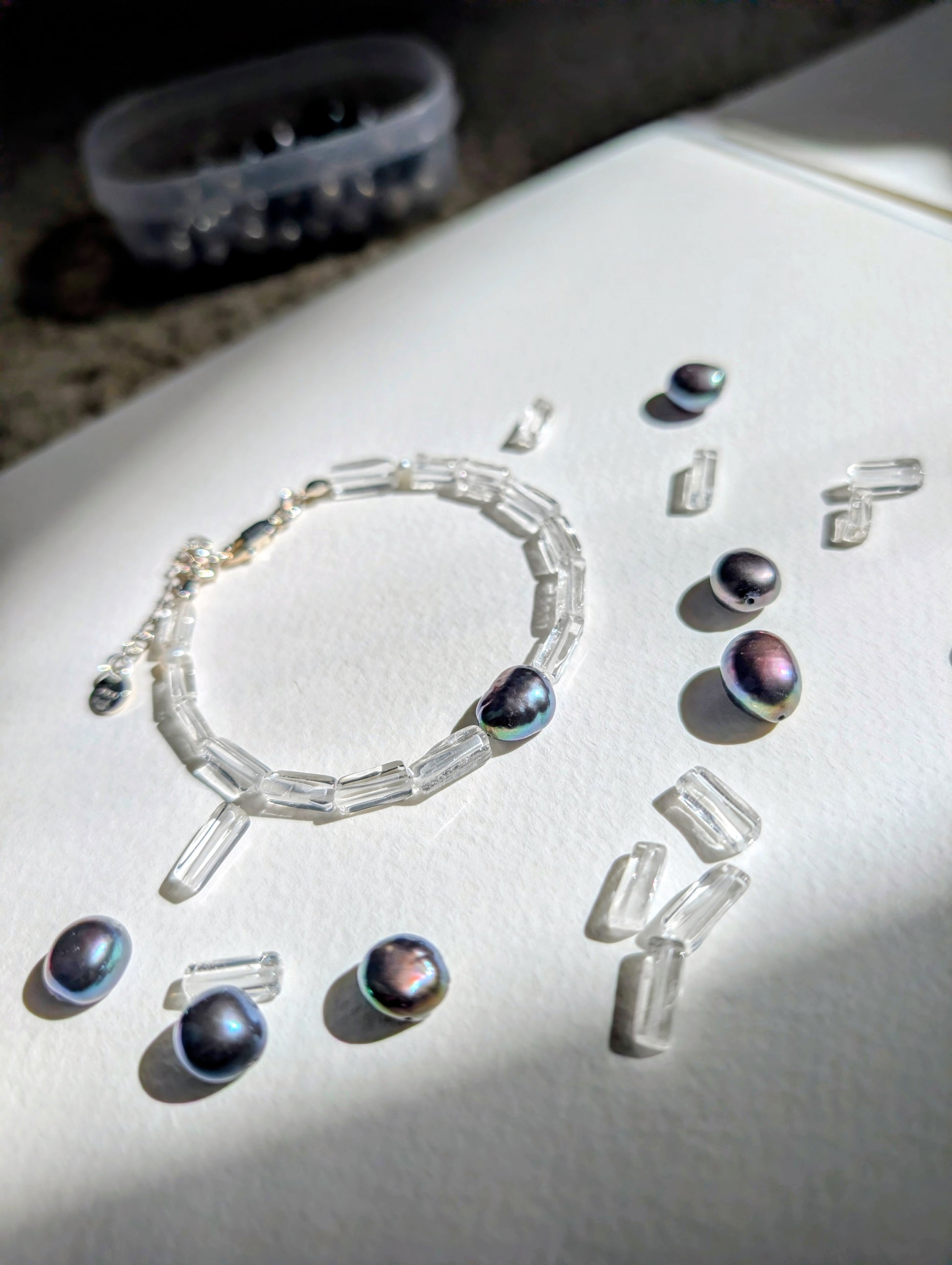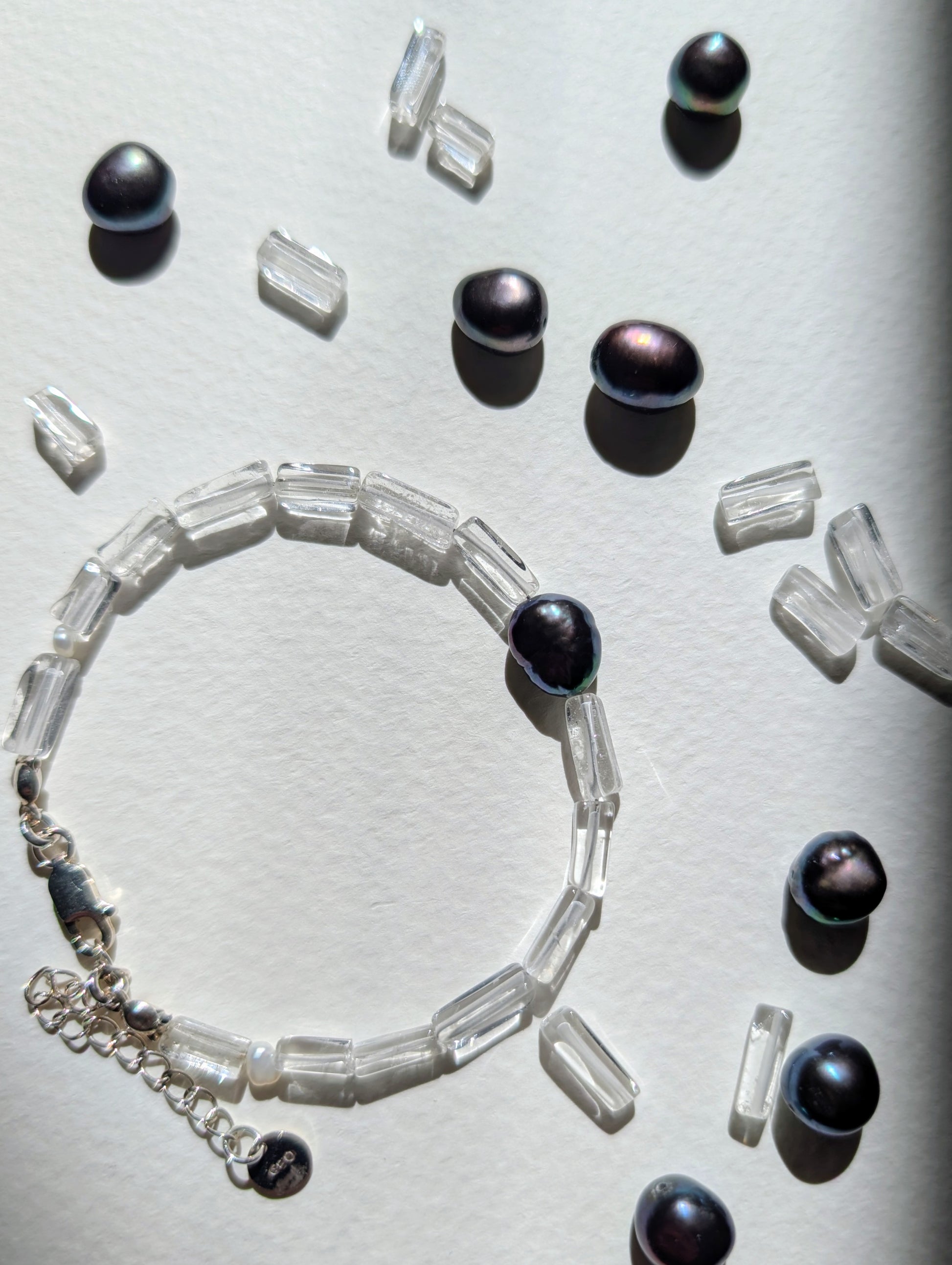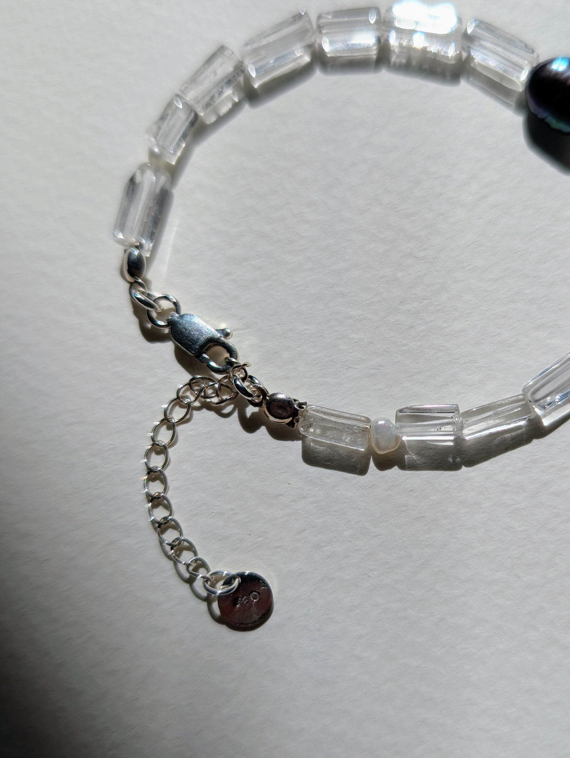The Glimmer Bracelet represents the fresh sparkle and shine of the ocean. The Clear Quartz and Freshwater Pearl duo symbolizes the contrast of clear "colourless" water with the wonderful dark blue hues that can be found in those picturesque moments spent by the sea. It's all in the art of noticing.